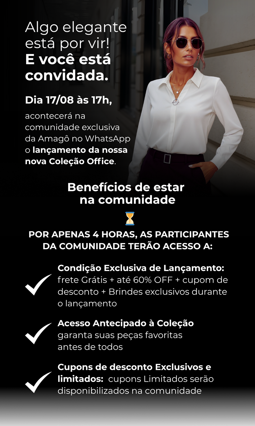 A Coleção Office foi criada para você — que trabalha muito, cuida de tudo e ainda faz questão de se sentir linda e confiante. Cada peça foi pensada para valorizar sua rotina no escritório com conforto, estilo e uma presença marcante.